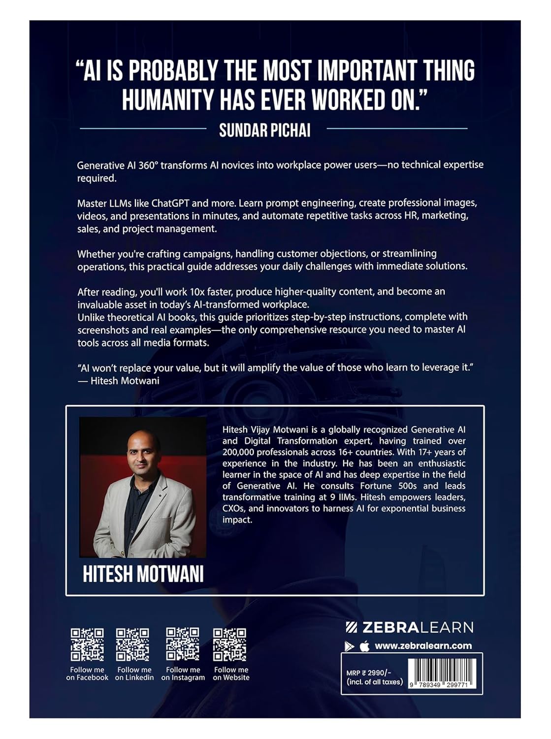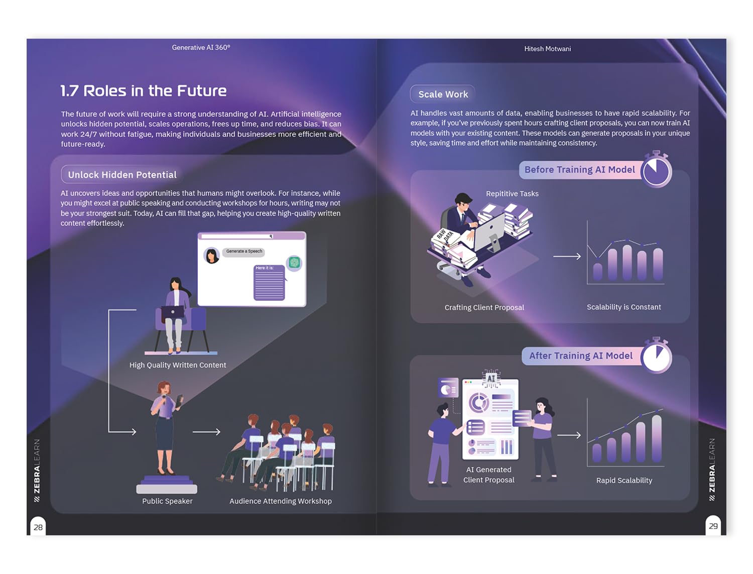 Generative AI 360° is more than just a book—it’s a visual, hands-on guide that turns AI beginners into workplace pros, with no tech skills needed. Packed with easy-to-understand visuals, step-by-step guides, and real-life examples, this book shows you how to use Generative AI tools to make your work easier and faster. IN THIS BOOK, YOU’LL LEARN HOW TO: > Use ChatGPT to create high-quality content for your projects, business, and more. > Create stunning images, videos, and presentations in just a few minutes using tools like Midjourney. > Automate repetitive tasks in areas like HR, marketing, sales, and project management to save time and boost productivity. WHO IS THIS BOOK FOR? > Professionals who want to get more done in less time without needing to learn complex tech. > Marketers who want to use AI tools to create effective, high-quality content. > Entrepreneurs who need simple, cost-effective AI tools to grow their businesses. > HR managers looking to automate tasks and improve efficiency > Sales teams who want to use AI to close deals faster and improve results Whether you’re designing marketing campaigns, automating customer service,